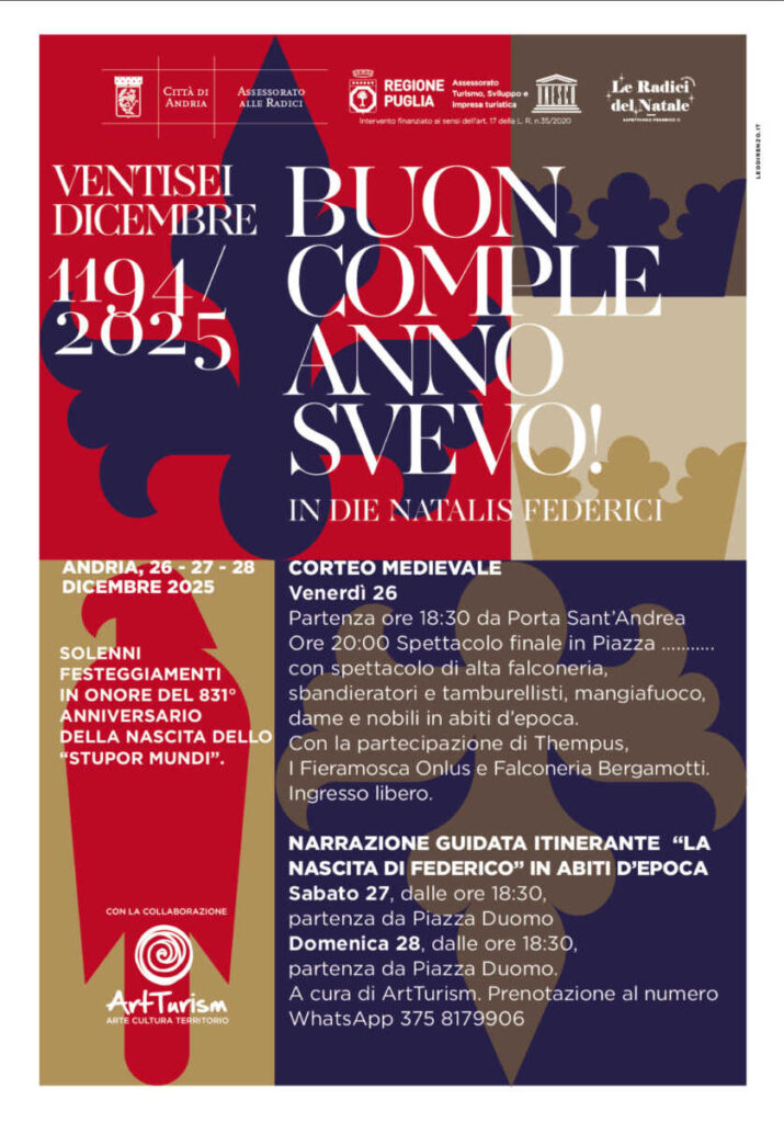 I festeggiamenti per la nascita dello “Stupor Mundi”, così appellato per le sue spiccate doti intellettive, cominceranno proprio il giorno del suo compleanno: venerdì 26 Dicembre, ma come da protocollo regale che si rispetti, Andria anche questa volta gli riserverà degna accoglienza e gratitudine, omaggiandolo con una festa che durerà per ben tre giorni, dal 26 al 28 dicembre 2025.
